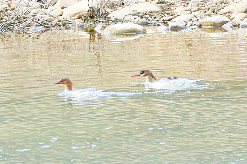 两只中华秋沙鸭在洛河中自由觅食。(本报通讯员 石 强 摄)本报讯 (通讯员 张欣欣)3月8日,商洛学院生物医药与食品工程学院石强和张博两位博士,在陕西省重要湿地——洛南县洛河湿地开展湿地鸟类多样性调查时,成功观测并记录到3只国家一级保护野生动物中华秋沙鸭,同时还发现了2只国家二级保护野生动物鸳鸯以及大量其他水鸟与林鸟。