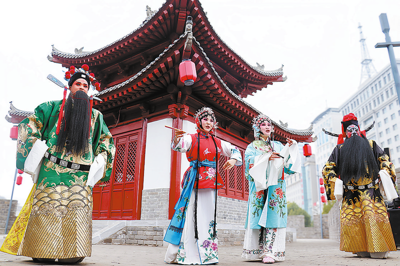 演出人员在商州故城墙上进行戏曲表演。