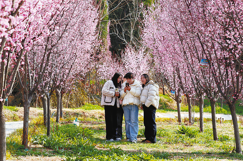 不远处,从宝鸡驱车前来的张先生一家正举着手机拍照。“刷到‘特别乌啦啦’的视频,看着太香了,干脆周末带着家人过来。”他指了指旁边的妻子,“她做攻略时发现,商州文旅今天正好在金凤山举行‘免费吃包子’活动,我们吃完包子就去赏花。”