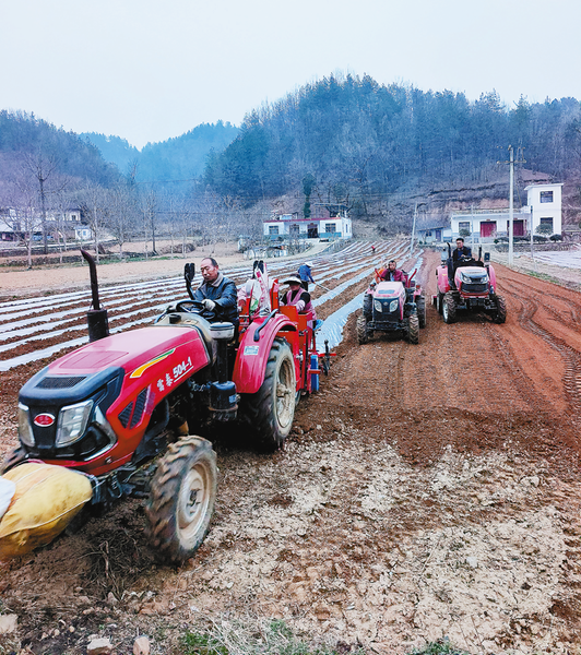 近日,趁着雨后放晴的有利时机,山阳县农业农村局组织农技人员深入田间地头,指导农户抢抓墒情加紧播种马铃薯。据悉,今年该县计划粮食播种面积稳定在四十二万亩以上,目前已完成春播面积九点三万亩。(本报记者 张英 摄)