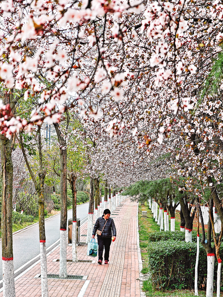 商州区江滨公园人行道旁,红叶李竞相绽放、香气袭人,市民穿 行其间,如入画境。细雨蒙蒙润芳菲,踏青寻春意正浓。3月14日的金凤山公园,烟雨萦绕间,5000多株红梅愈显清丽,专程从西安自驾而来的牛倩倩一家沉醉其中,打卡拍照赏春之余偶遇商州文旅邀请游客免费品尝特色包子的暖心活动,不禁感慨道:“雨天赏花自有一番诗意,随手拍照都很出片、整体体验很舒心,驱车100多公里的路程,赴这一场春日的花海之约,简直太值了!”牛倩倩表示,已经向自己的亲朋好友进行了大力推荐,让大家都来商洛感受春天的美好。