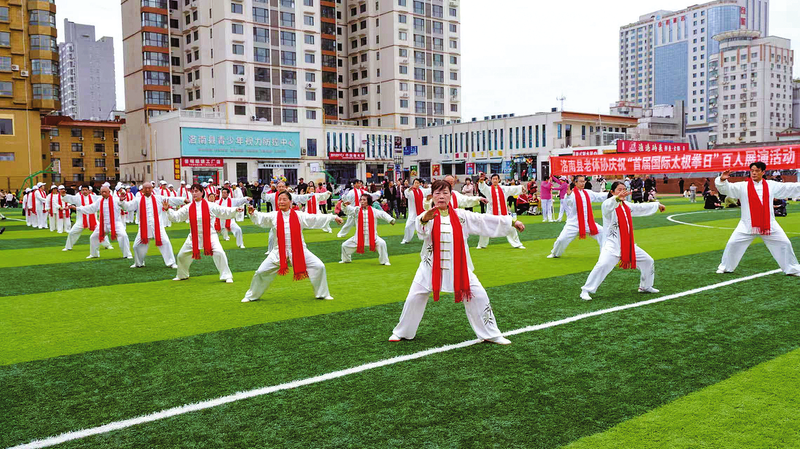 3月21日,洛南县老体协庆祝首届“国际太极拳日”百人太极拳展演活动,在该县工人文化宫隆重举行,来自全县9支健身队的160多名太极拳爱好者齐聚一堂,集中展示洛南县全民健身成果。 (本报通讯员 郭夏季 摄)