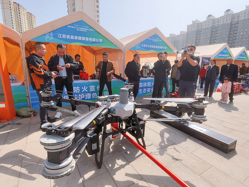 3月27日,陕西省2026年森林草原防火宣传月集中宣传活动在洛南县惠民广场启动,消防无人机等新型科技森林防火器械亮相现场,专业人员讲解其应用功能并进行演示,现场吸引众多群众驻足观看。 (本报通讯员 刘卫锋 摄)