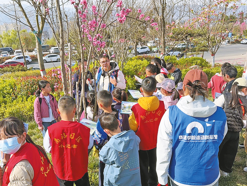 当天9时许,小记者满怀期待地在金凤山公园入口集合,志愿者统一为大家分发了植物图鉴卡、绘画垫板等实践工具。随后,在商洛学院生物学院博士张博的带领下,小记者们步入金凤山公园。一路上,张博以通俗易懂的语言,生动讲解各类花草植物的生长特性与生态故事,并穿插诵读经典咏春诗词,让孩子们在欣赏山花烂漫的同时,汲取自然知识,感悟传统文化的深厚魅力。跟着老师的解说,小记者们一边仔细观察花草形态,一边认真记录春日见闻。
