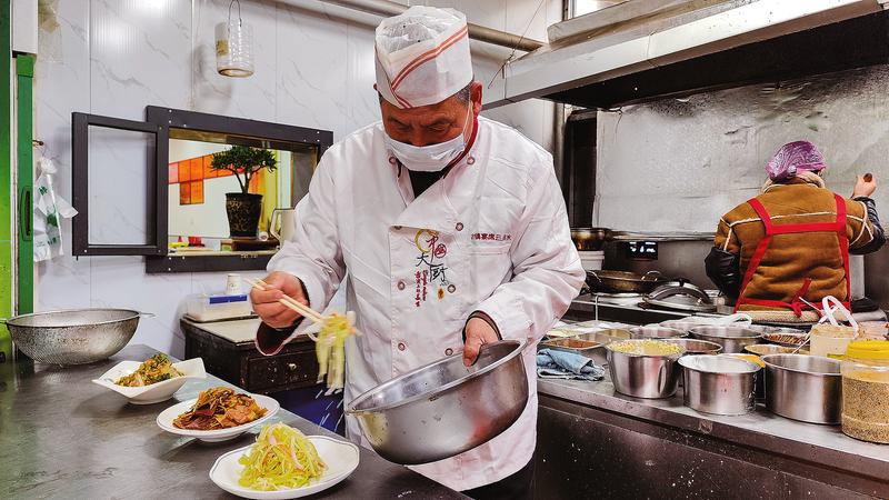 3月21日中午时分,柞水县凤凰古镇老街上,人来人往,烟火气渐浓。位于下街头的屈记古镇私房菜店内,更是热闹非凡:前厅里,食客围坐闲谈,杯盏轻碰;后厨内,灶火正旺。56岁的店老板屈勇系着围裙,在蒸腾的热气间来回穿梭,时而俯身察看火候,时而扬手翻锅装盘,锅铲声、招呼声交织在一起,一切显得忙碌而有序。